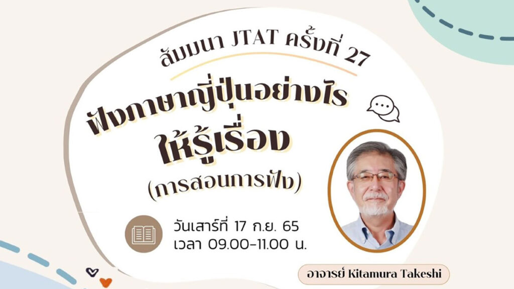 ขอเชิญเข้าร่วมฟังการสัมมนาครั้งที่ 27 ของสมาคมครูภาษาและวัฒนธรรมญี่ปุ่นแห่งประเทศไทย หัวข้อ “ฟังภาษาญี่ปุ่นอย่างไรให้รู้เรื่อง” ทางช่องทางออนไลน์ วันเสาร์ที่ 17 กันยายน 2022 เวลา 9:00-11:00 น. ผู้สนใจสามารถสมัครโดยการสแกน QR Code ในโปสเตอร์