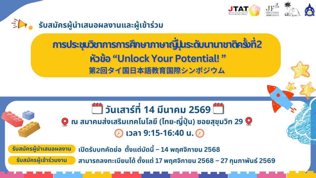 สมาคมครูภาษาและวัฒนธรรมญี่ปุ่นแห่งประเทศไทย (JTAT) ร่วมกับกลุ่มศึกษาภาษาญี่ปุ่นในประเทศไทย (AJLET) สมาคมส่งเสริมเทคโนโลยี (ไทย-ญี่ปุ่น) และเจแปนฟาวน์เดชั่น กรุงเทพฯ ขอเรียนเชิญเข้าร่วม/นำเสนอผลงานในการประชุมวิชาการการศึกษาภาษาญี่ปุ่นระดับนานาชาติครั้งที่ 2 ในหัวข้อ