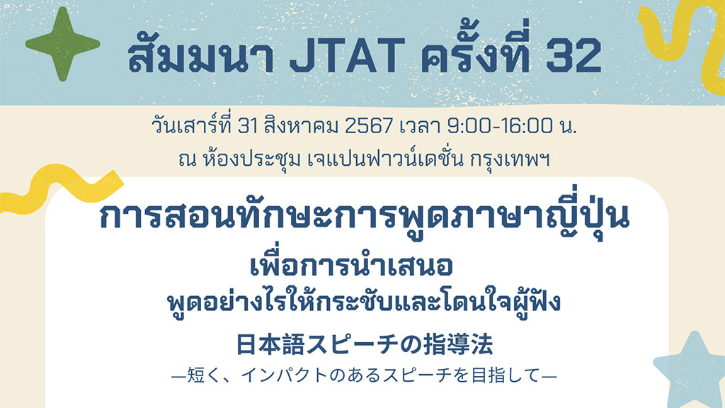 สัมมนา JTAT ครั้งที่ 32 หัวข้อ “การสอนทักษะการพูดภาษาญี่ปุ่นเพื่อการนำเสนอ : พูดอย่างไรให้กระชับและโดนใจผู้ฟัง”